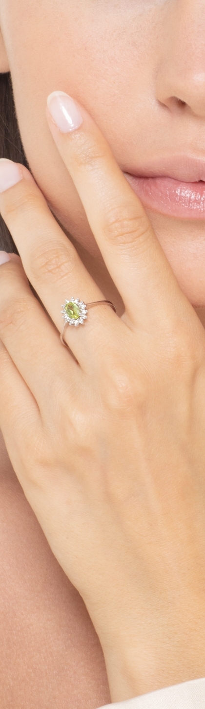 The halo ring with diamonds is the perfect engagement ring. In this smaller version, a green peridot shines at its centre. Nowadays, this bright gemstone is loved for its green color with golden-yellow undertones, while in ancient times, the peridot was believed to bring good luck and this is why it was and still is often gifted as an engagement ring or to celebrate a birthday.