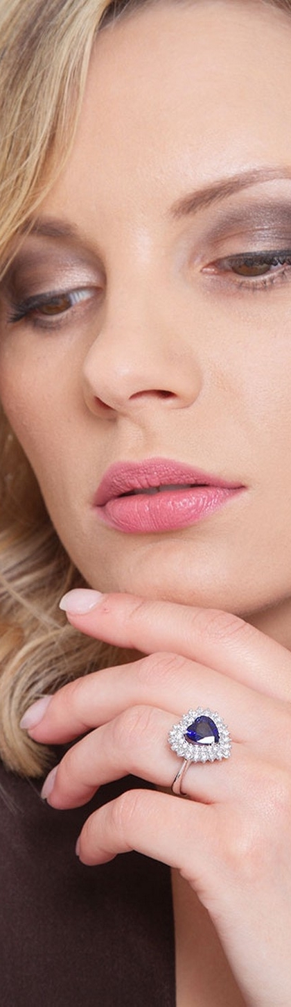 Halo ring with blue sapphire heart cut and diamonds white gold 18k