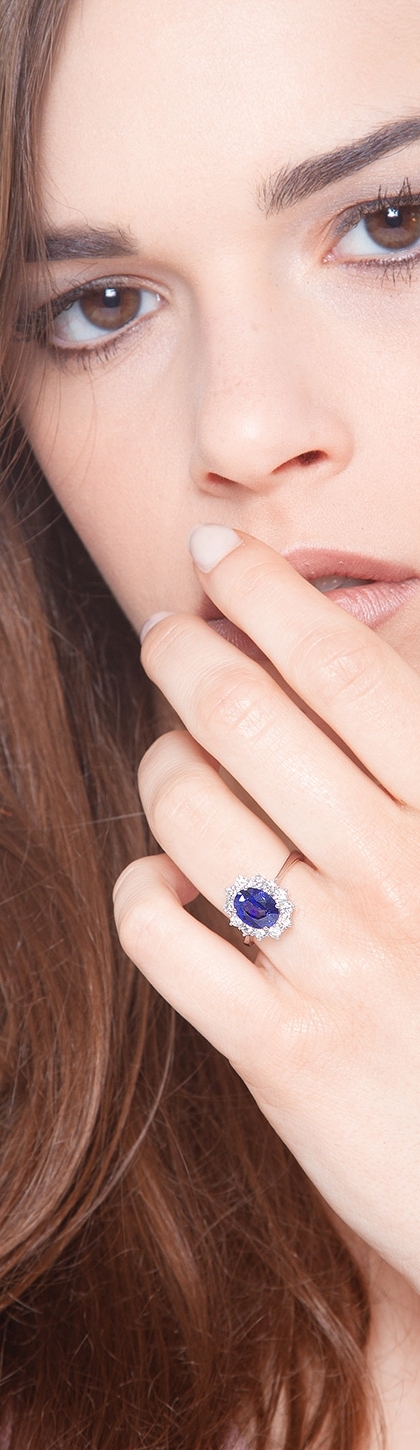 Halo ring with diamonds and blue sapphire oval cut in 18k white gold