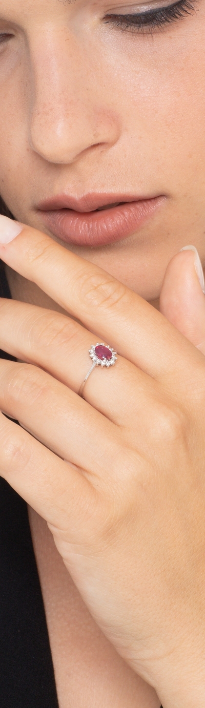 Halo ring with ruby oval cut and diamonds in white gold 18k