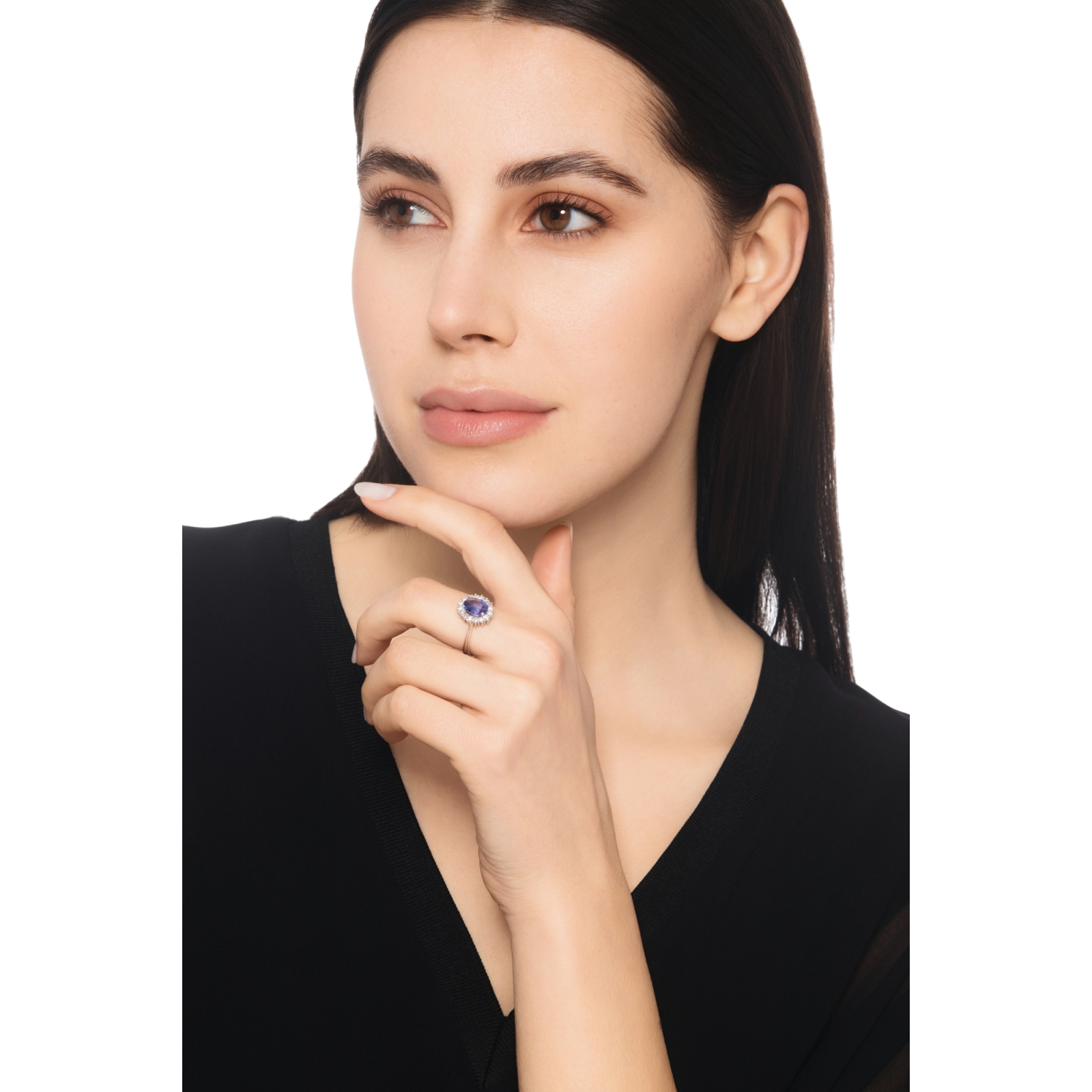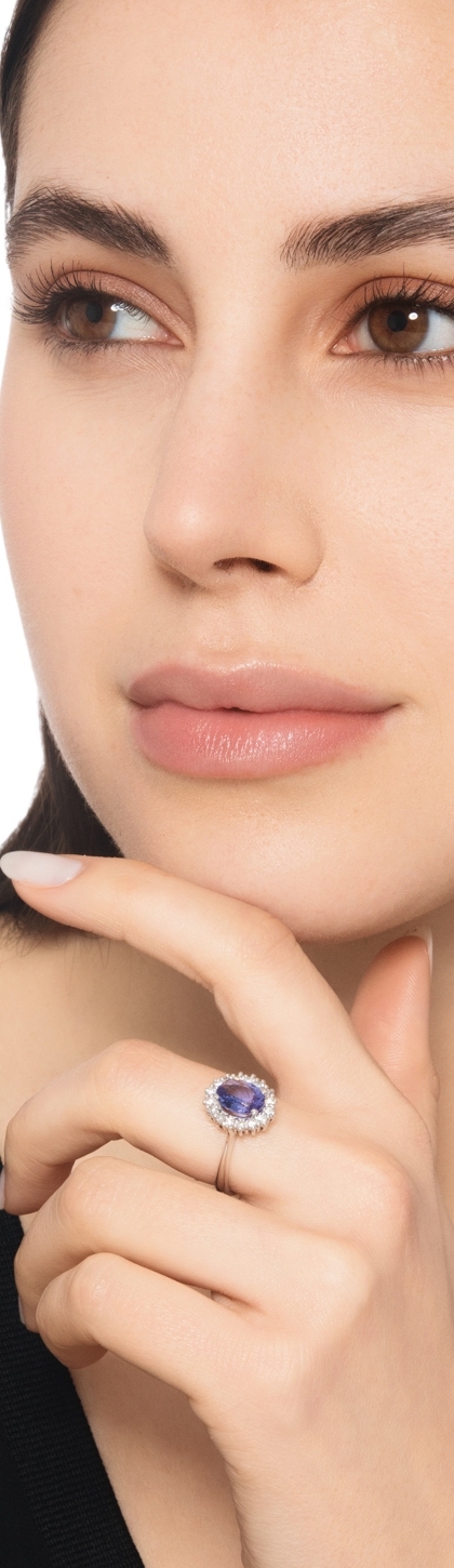 Classy look with a twist: this diamond halo ring features a central oval-cut tanzanite whose purple-blue color makes it truly stand out.