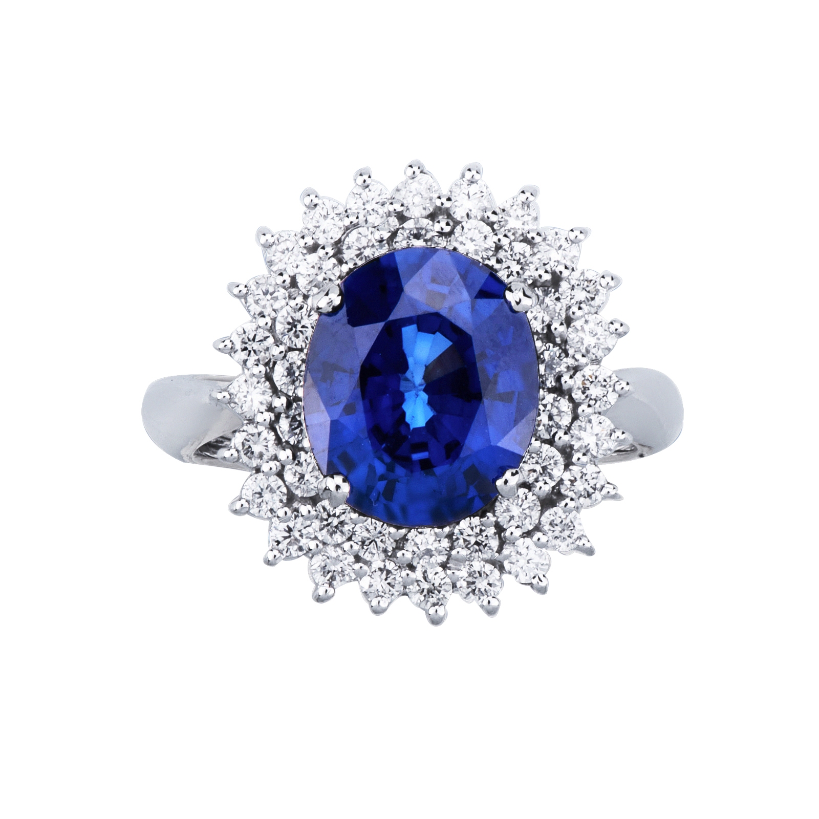 Lady D Ring with double diamond halo and blue sapphire