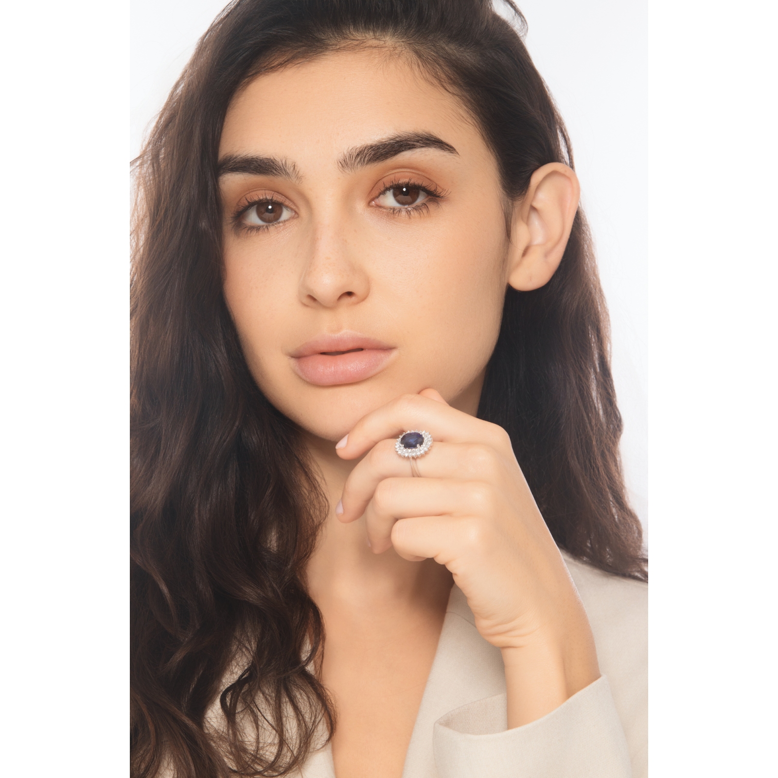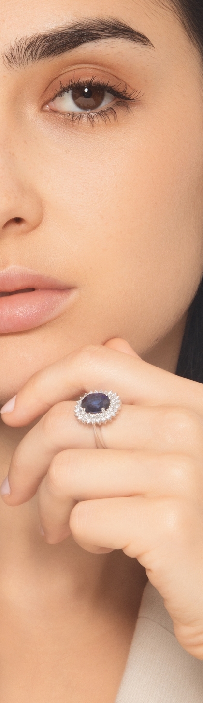 The ring has a classic look and it is crafted in 18kt white gold which beautifully highlight the gemstones. Moreover, the central oval-cut blue sapphire measures about 11x9mm while the diamonds are all brilliant-cut and have H color and VS clarity.