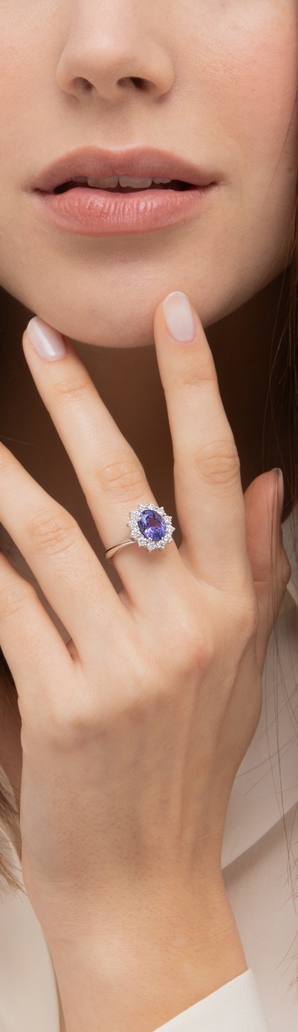 Ring in white gold 18k with central oval tanzanite and halo in diamonds