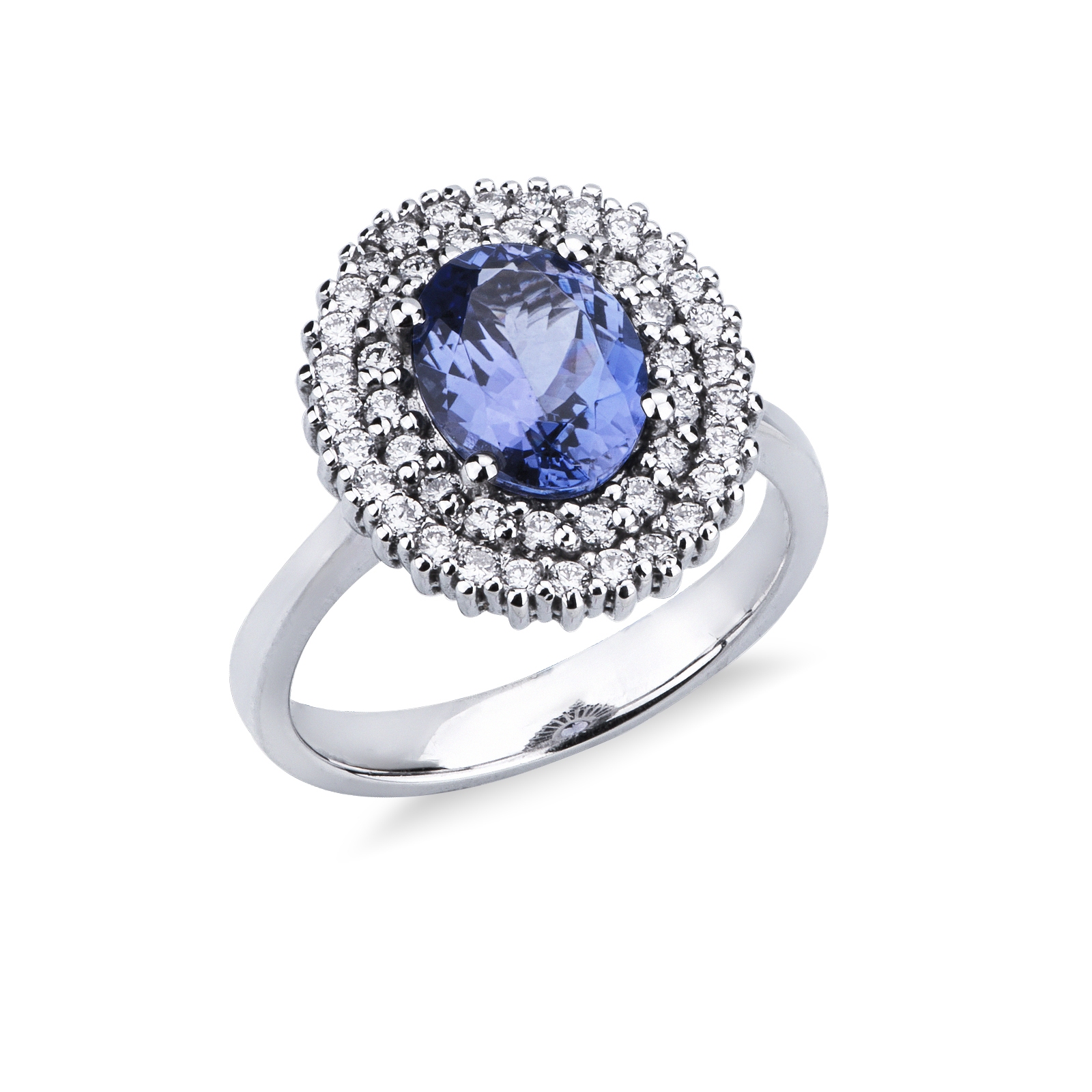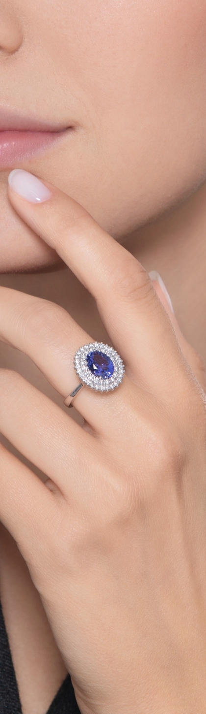 This cocktail ring is crafted in 18kt white gold and features a central oval tanzanite surrounded by a double diamond halo. The diamonds are brilliant-cut and have H colour and VS clarity, making them the perfect balance of quality and brilliance.