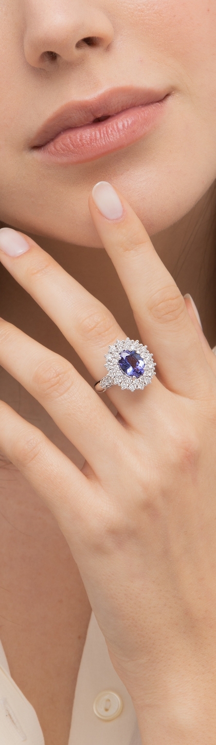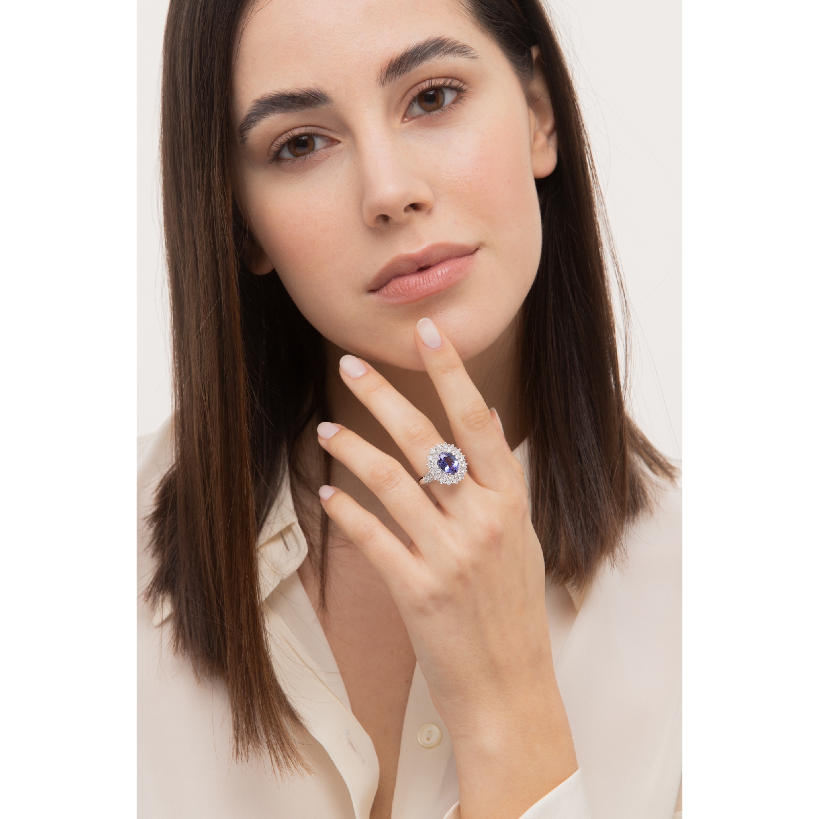 Stunning cocktail ring featuring a central tanzanite surrounded by two rows of white diamonds that create a beautiful halo of light framing it. They are all brilliant-cut with H color and VS clarity.