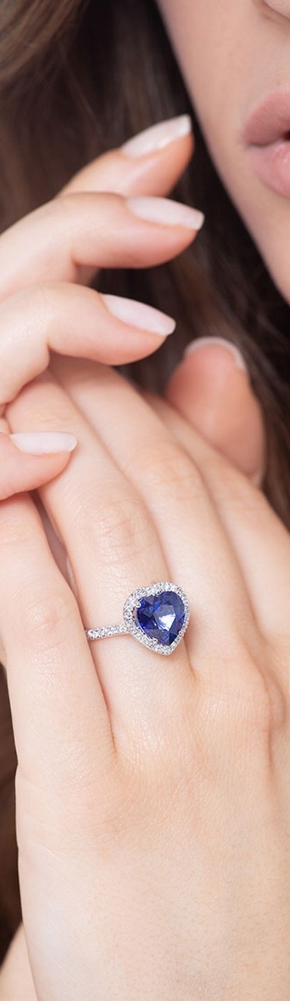 White gold 18k halo ring with a heart cut blue sapphire and diamonds shoulder set