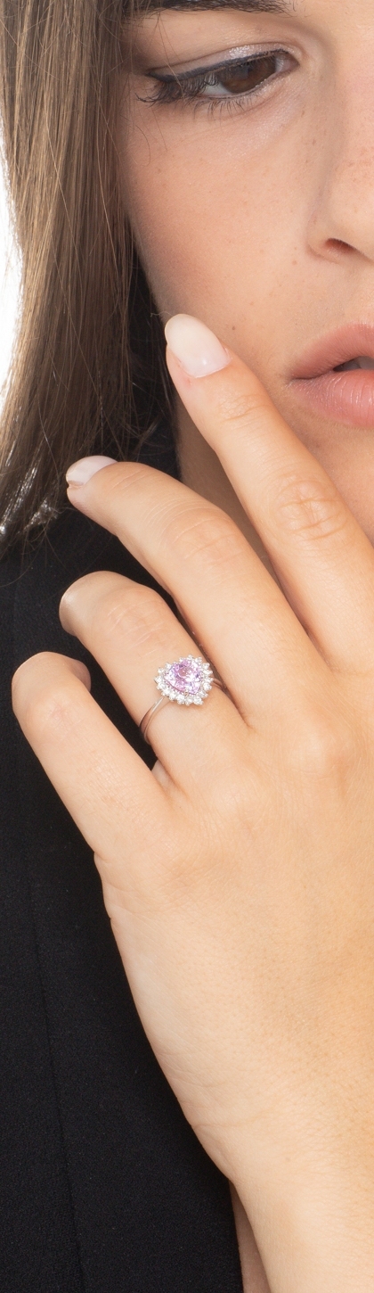 Diamond ring with a central heart-cut pink sapphire crafted in 18kt white gold. The diamonds that beautifully hug the pink sapphire, forming an halo of light around it, are all brilliant-cut and have H colour and VS clarity.