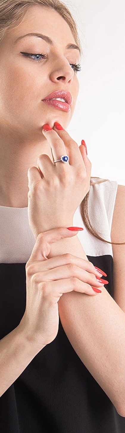 White gold 18k halo ring with blue sapphire heart cut and diamonds
