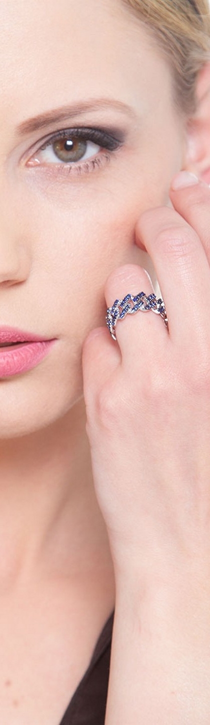 White gold 18k cuban chain link with blue sapphires brilliant cut. The band is about 8 mm wide.