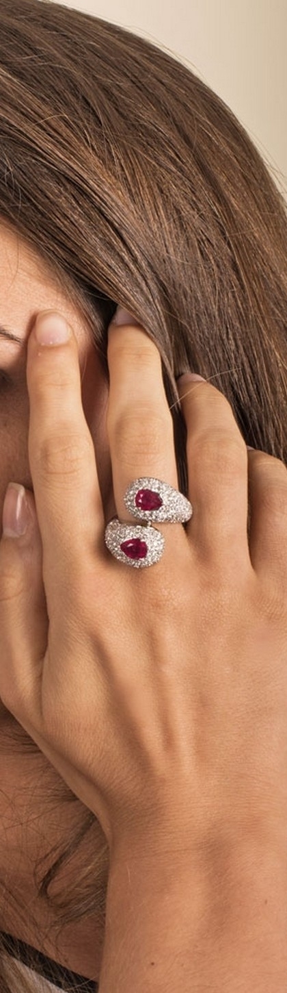 White gold 18k TOI&MOI ring with diamonds and rubies pear cut
