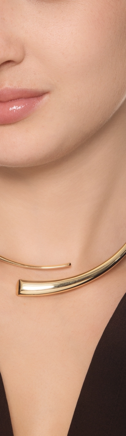 Bypass rigid necklace in 18kt yellow gold. The bypass design of this necklace features a neck-hugging shape where the ends sweep past the front. One end of the necklace is wider, resulting in a contemporary materical shape. Therefore, the asymmetrical silhouette feels modern and dynamic and makes this necklace perfect to wear with both casual and more elegant outfits.