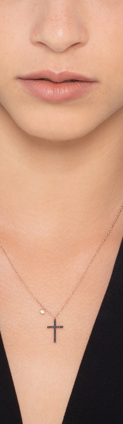 Rose gold 18k pendant with black diamonds cross and a solitaire diamond