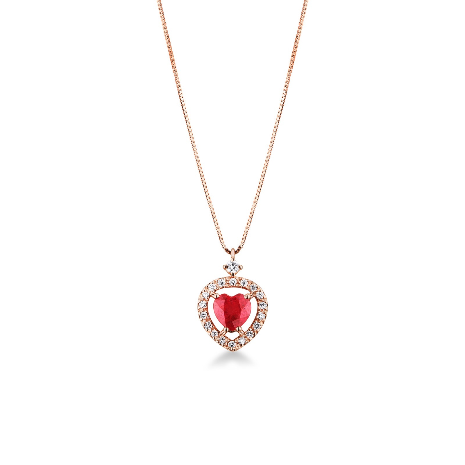 18k rose gold necklace with halo heart ruby and diamonds pendant