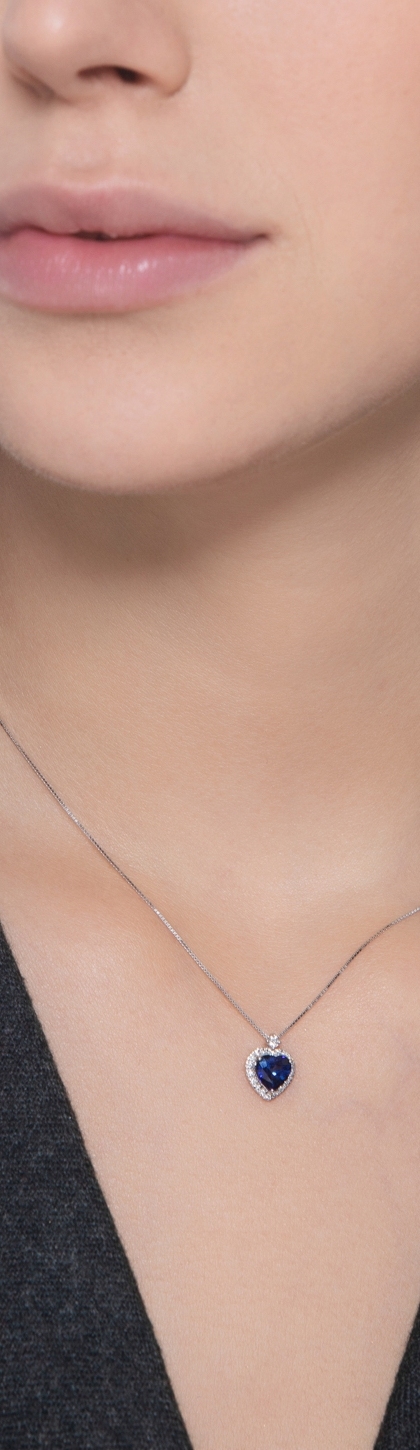 18k white gold necklace with blue sapphire heart pendant and diamonds