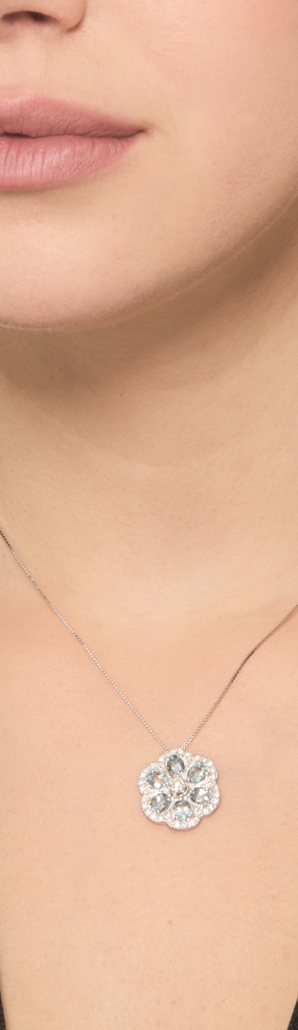18k white gold necklace with flower pendant aquamarine and diamonds