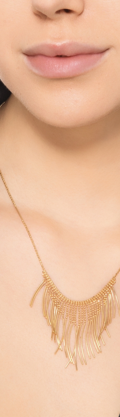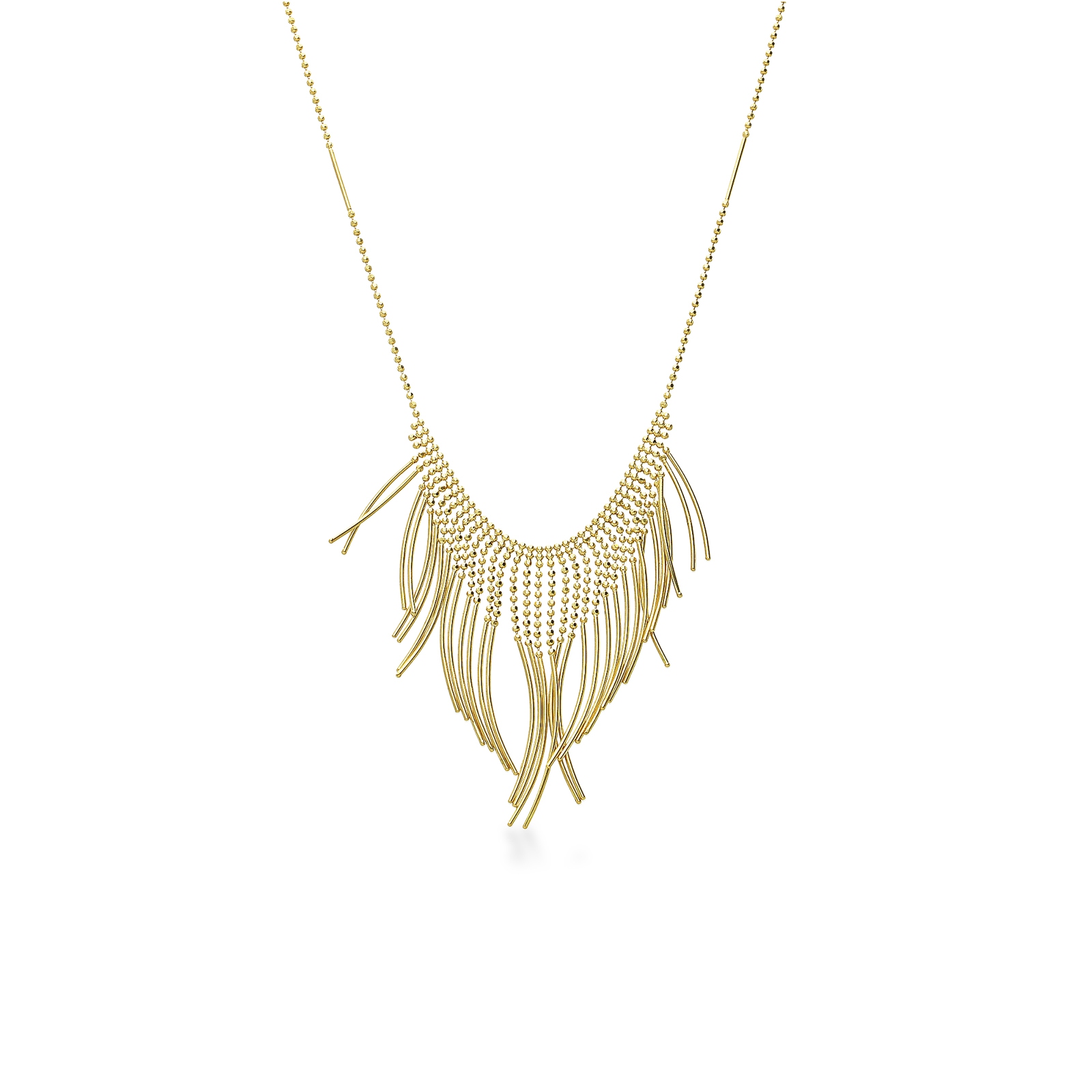 Flowy and lightweight, this bohemian necklace is crafted in 18kt yellow gold. A delicate chain is adorned at its centre with a multitude of tiny beads, ending in several slender bars that create a graceful, elegant silhouette.
