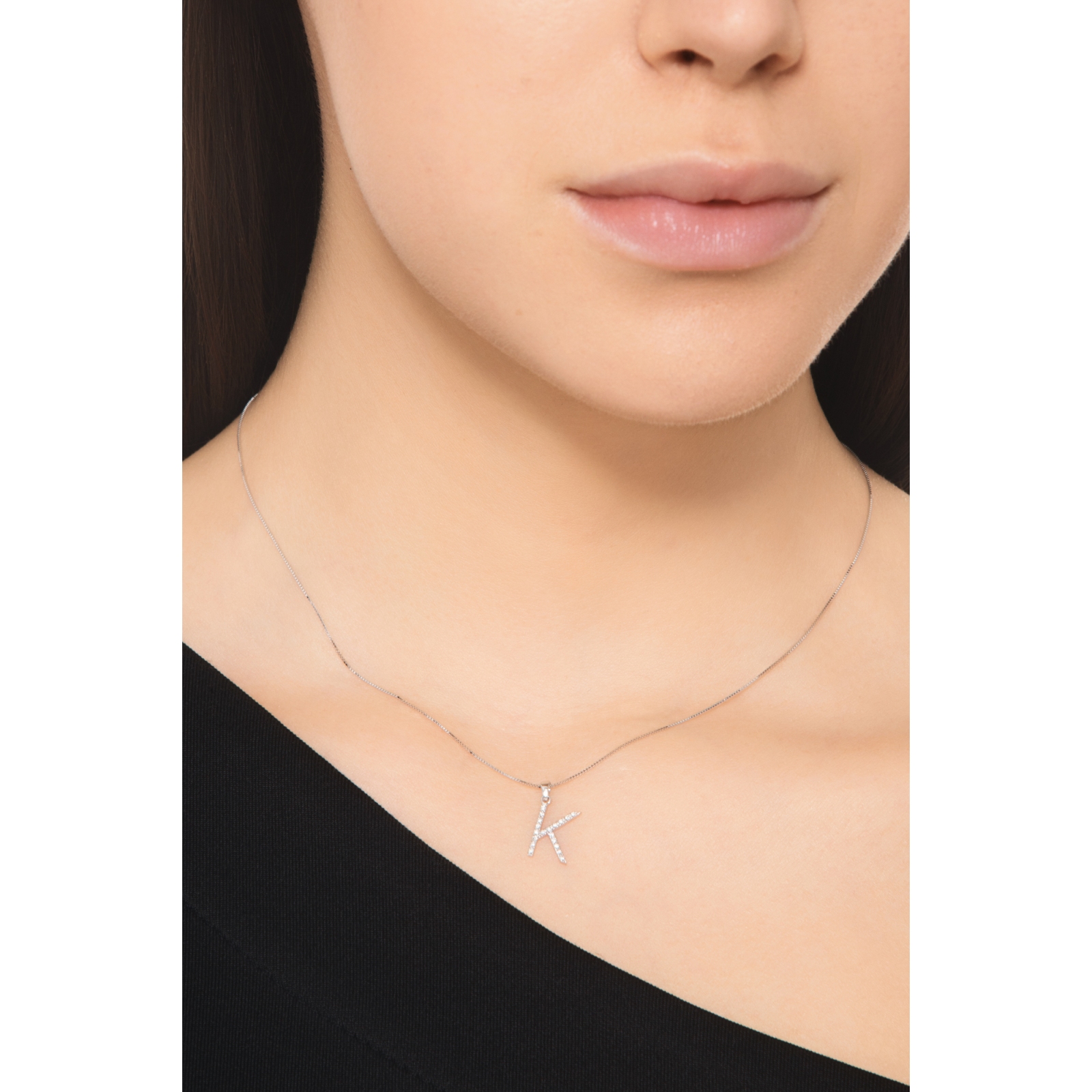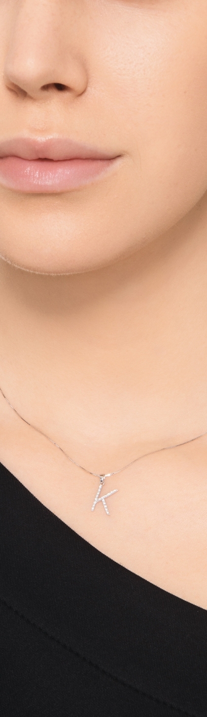 This 18kt white gold necklace features a K pendant set in shiny white diamonds. The initial measures approximately 1x0.7cm and the diamonds have H colour and clarity VS.
