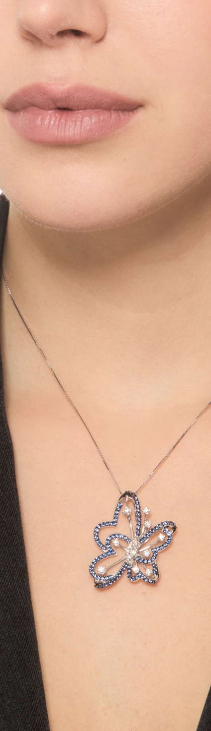 Necklace in white gold 18k with blue sapphires and diamonds butterfly pendant