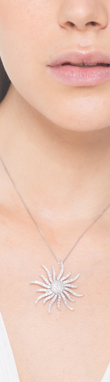 Necklace in white gold 18k with sun pendant in diamonds brilliant cut, H color, Vs clarity.