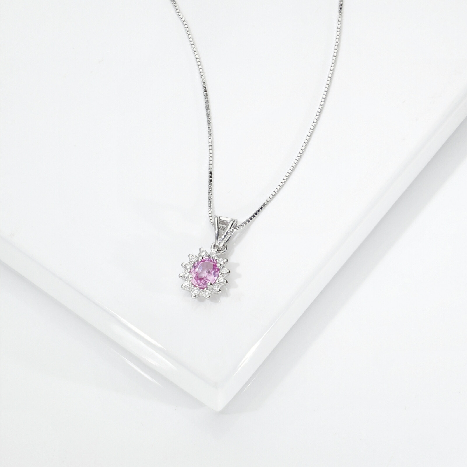 This 18kt white gold necklace showcases a central pink sapphire surrounded by a halo of white brilliant-cut diamonds, with H color and VS clarity.