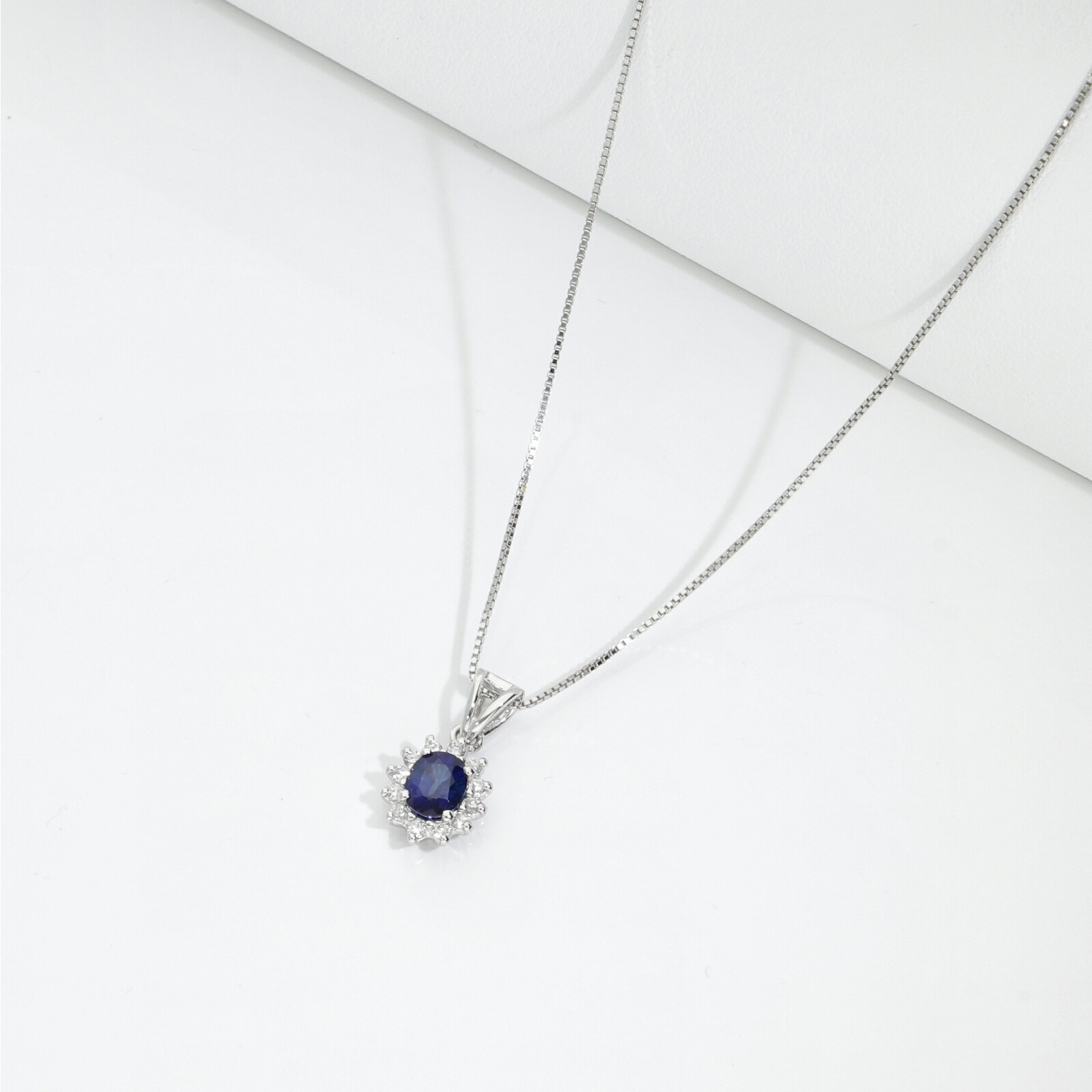 This 18kt white gold necklace features a central blue sapphire surrounded by a halo of white brilliant cut diamonds with colour H and clarity VS. The central stone measures approximately 5x4mm.