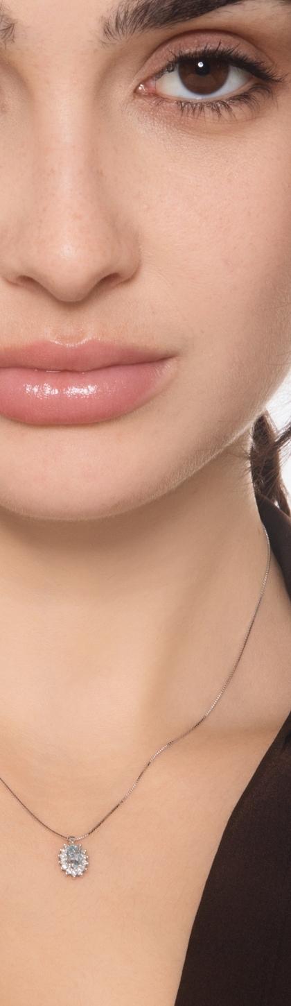 This aquamarine and diamond necklace is perfect to wear on a daily basis since the light blue color of the central piece and the extreme light of the diamonds will add a touch of elegance to any occasion. You can also pair it with one of our aquamarine and diamond halo earrings (studs or pendant) for a complete look.