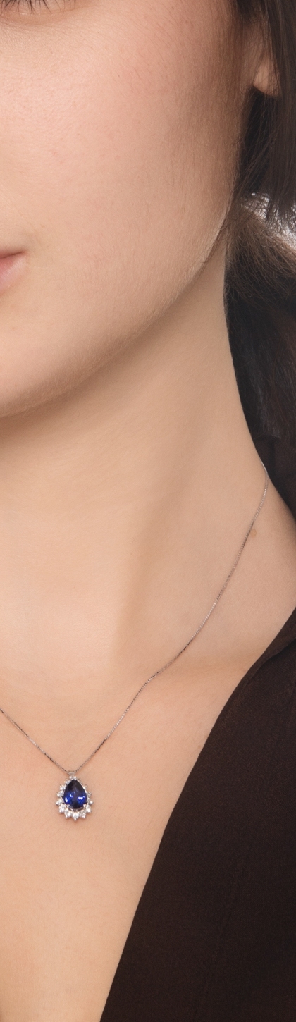 Necklace in white gold 18k with blue sapphire pear cut and diamonds