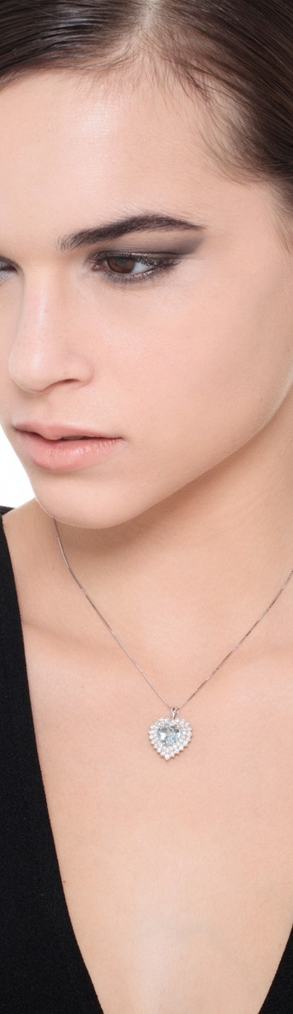 Necklace with pendant, central heart cut aquamarine and 2 rows of diamonds