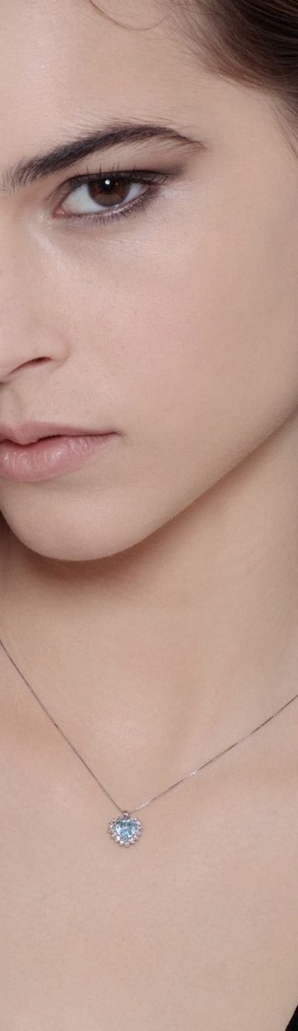 Necklace with pendant, central heart cut aquamarine and crowned by diamonds