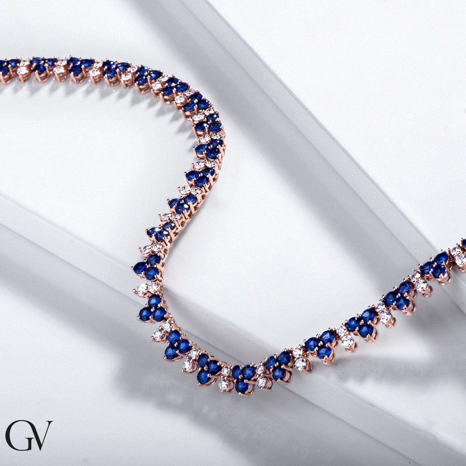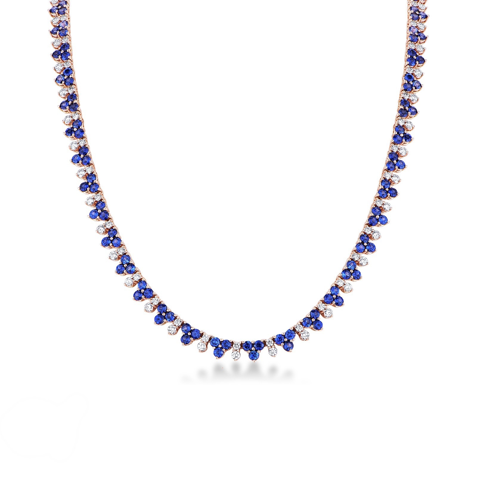 18k rose gold tennis necklace featuring blue sapphires and diamonds